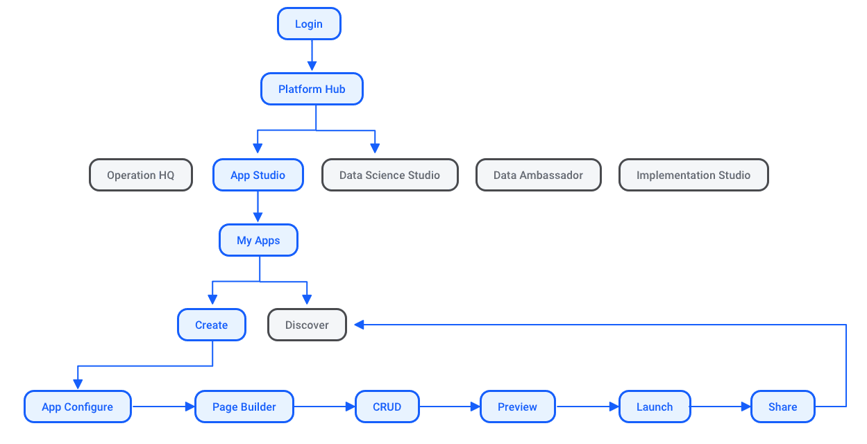 A senior interaction designer and I were assigned to design the App Studio experience and explore how we could visually improve onboarding. We jumped straight into wireframing key milestones that the team knew users were asking for. Everything needed to be strung together into a clearer, more cohesive experience. We rapidly iterated toward what we felt was the simplest, most user-centric flow through the App Studio suite — building a hub to anchor all the other experiences.