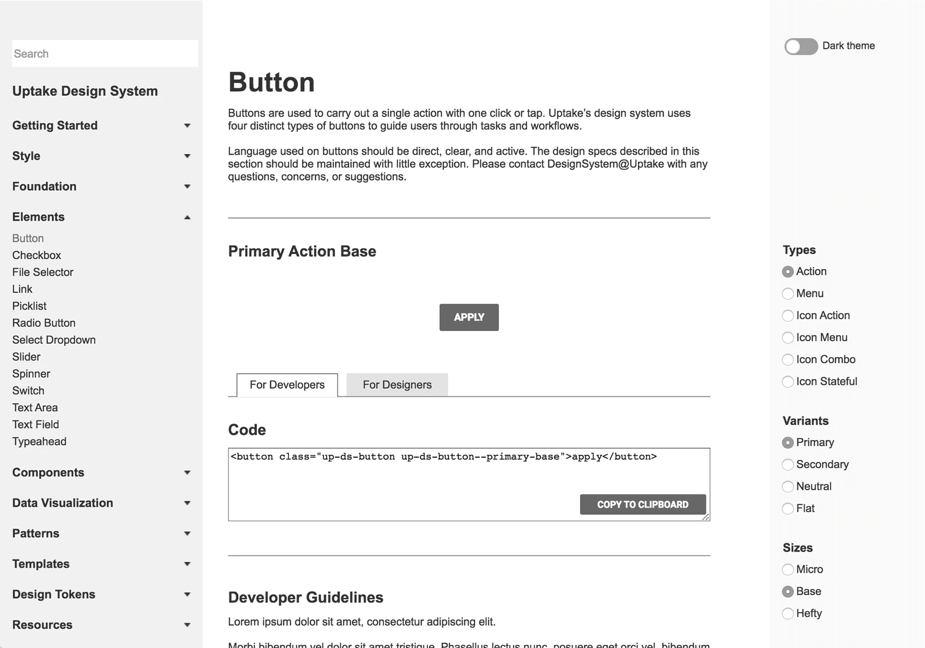 Serving as a centralized hub, the doc side became an oasis for design and engineering. It enabled developers to access reusable components through Vue, Angular, and React libraries, helping teams build efficiently while reducing technical debt. And designers could quickly view and interact with components, read about their usage, and contribute feedback.